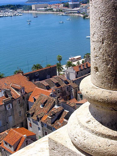 Romerska murar över dagens bostäder och butiker SplitFrån campingplatsen i Omis kan man ta en buss in till Split. Den går en gång i timmen från stationen i Split och sedan är det endast en kort promenad ner till den praktfulla hamnpromenaden. Hamnpromenaden är anlagd och ligger precis framför det romerska palatset: Diokletians palats som låg ända nere vid vattnet tidigare. I dag kan man slå sig ned på någon av alla de bänkar som finns under de höga dadelpalmerna och skåda bort mot palatsets murar. Särprägeln uppstår genom att invånarna under tidens gång har byggt sina hus på de gamla ärofyllda murarna. Antingen ovanpå eller i murens/palatsets nedre etage. Här dalar temperaturen betydligt och det är en anledning till att ett antal bodar slagit sig ned här för att sälja till turister. Allt från t.- shirts till smycken.Den fyrkantiga platsen, det gamla romerska forumet vittnar om medelålderns annorlunda byggnadsstil. Här ses allt från venetiansk stil till barock. Splits inre stadsdel finns med på UNESCOs världsarvslista och alla de smala gatorna inbjuder till ett mycket intressant tidsstudium.