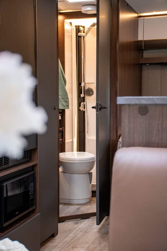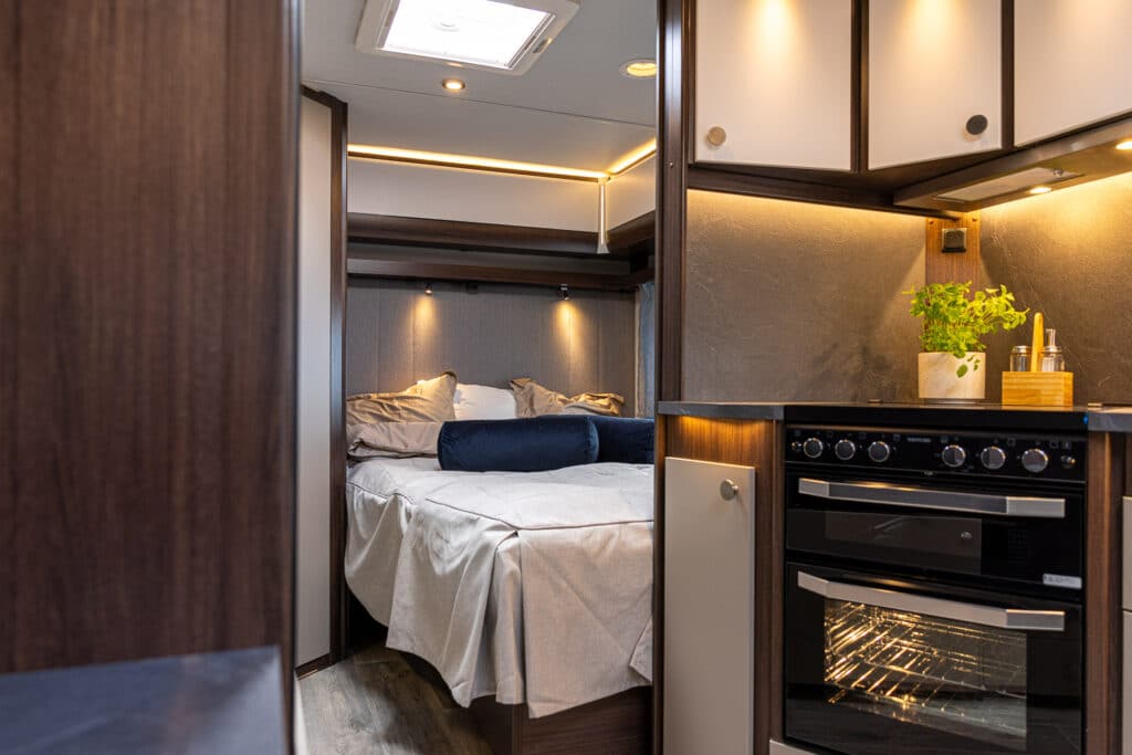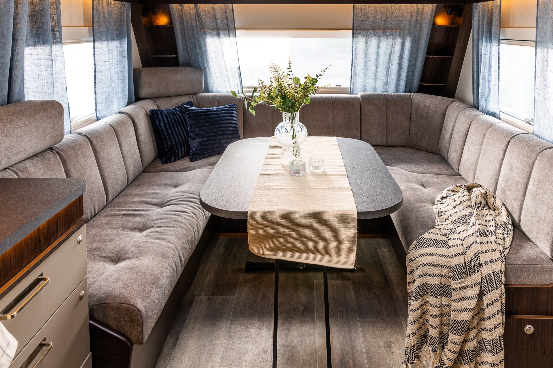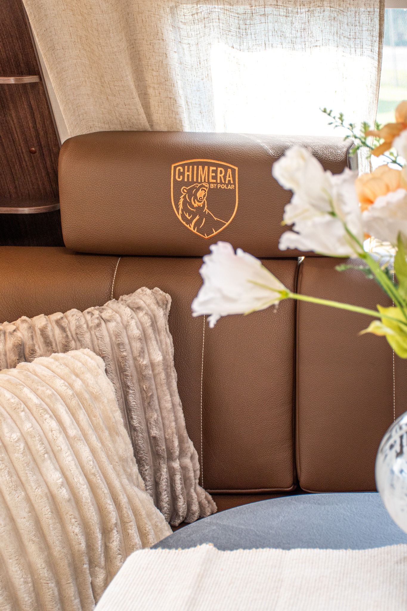 En annan nyhet är att hörndusch finns som tillval i 590 FWL Chimera. Inredningen i lyxiga Chimera-serien har även fått några små uppdateringar, till exempel nackkuddar broderade med Chimera-emblemet, nya handtag och diskho i svart. Vidare får planlösningarna BQD och Q bredare sängar, 150 centimeter i stället för 140. I BQD-vagnarna blir det standard med elektrisk säng oavsett linje. Ytterligare en nyhet inför 2026 är att badrumsdörrarna på hörn- och mitt-toaletterna blir infällda och tjockare, vilket ger bättre rörelseutrymme, mer ljudisolering och större avskildhet. Slutligen finns en ny klädsel, nämligen Irene i brunt skinn.