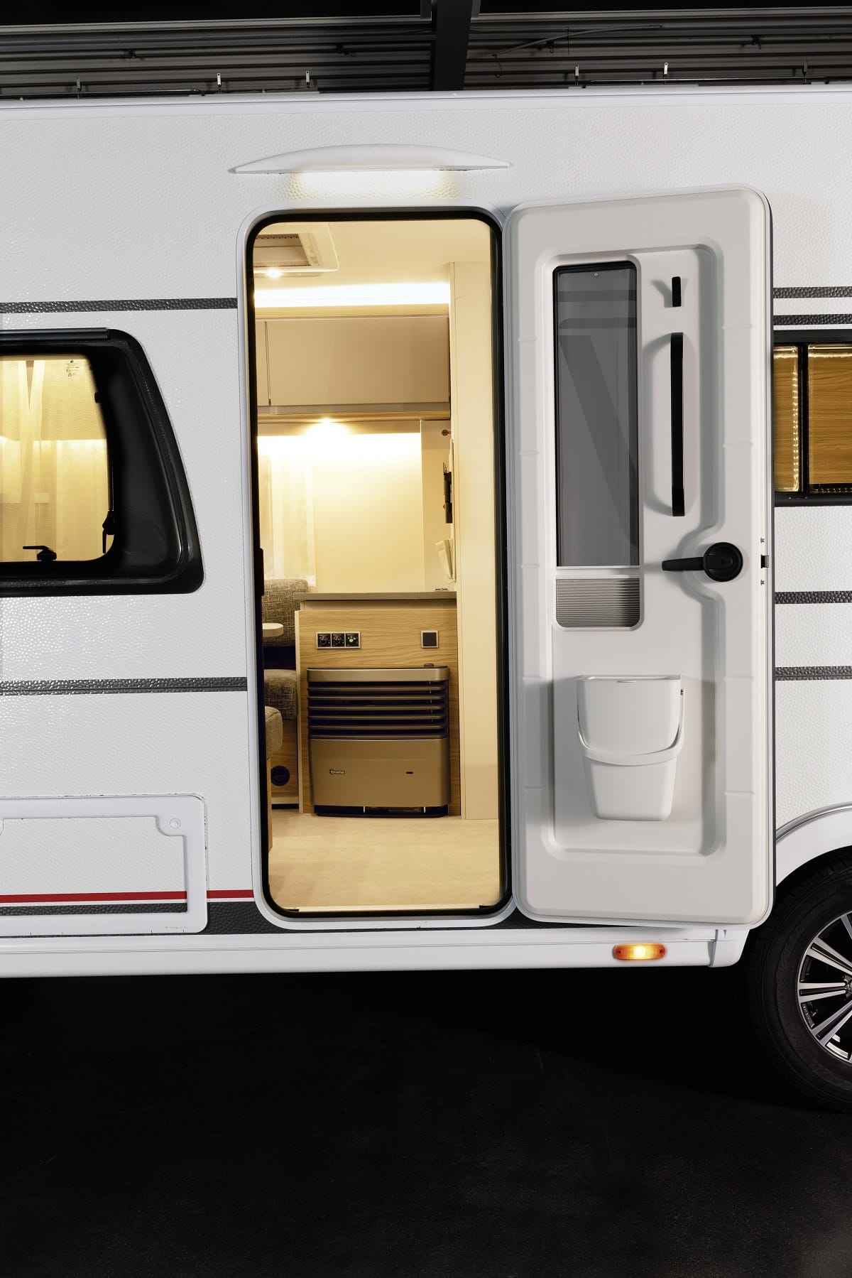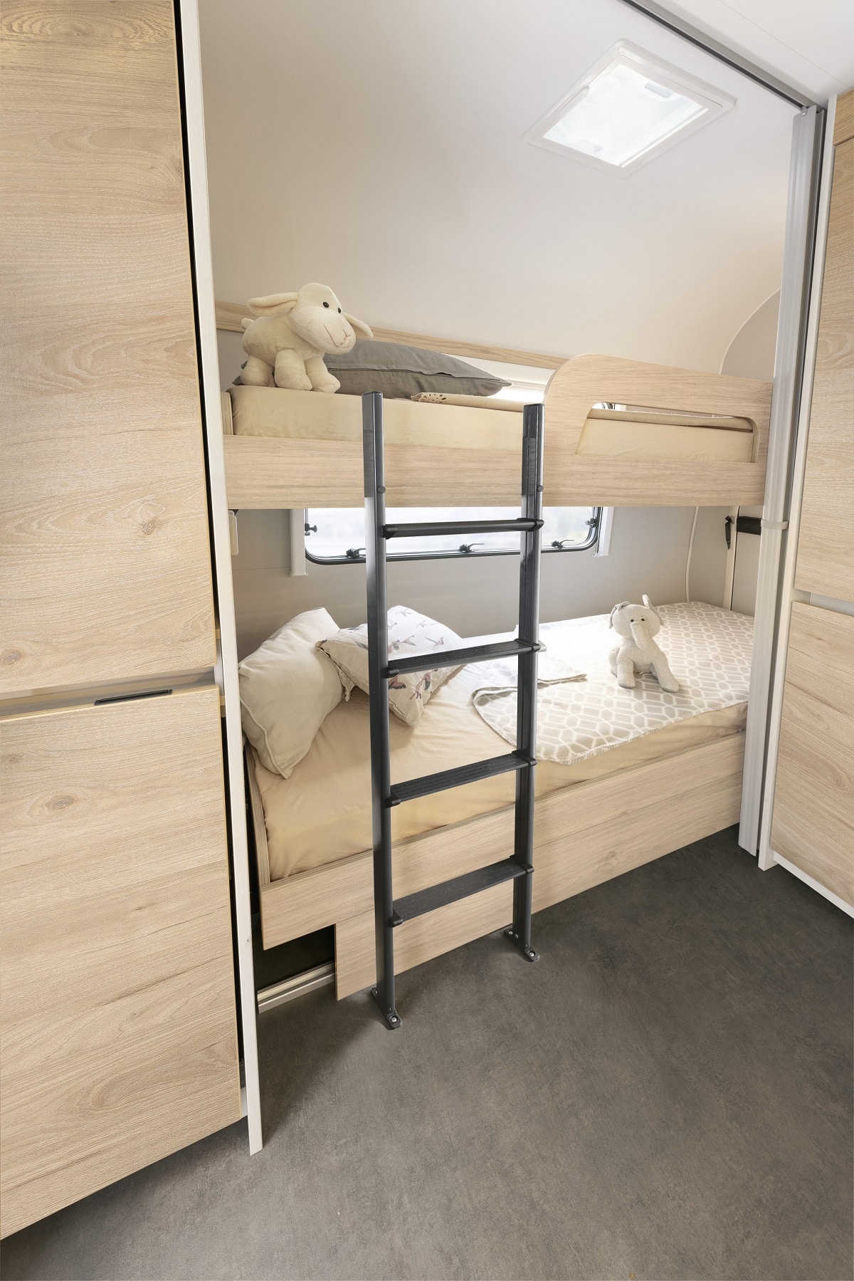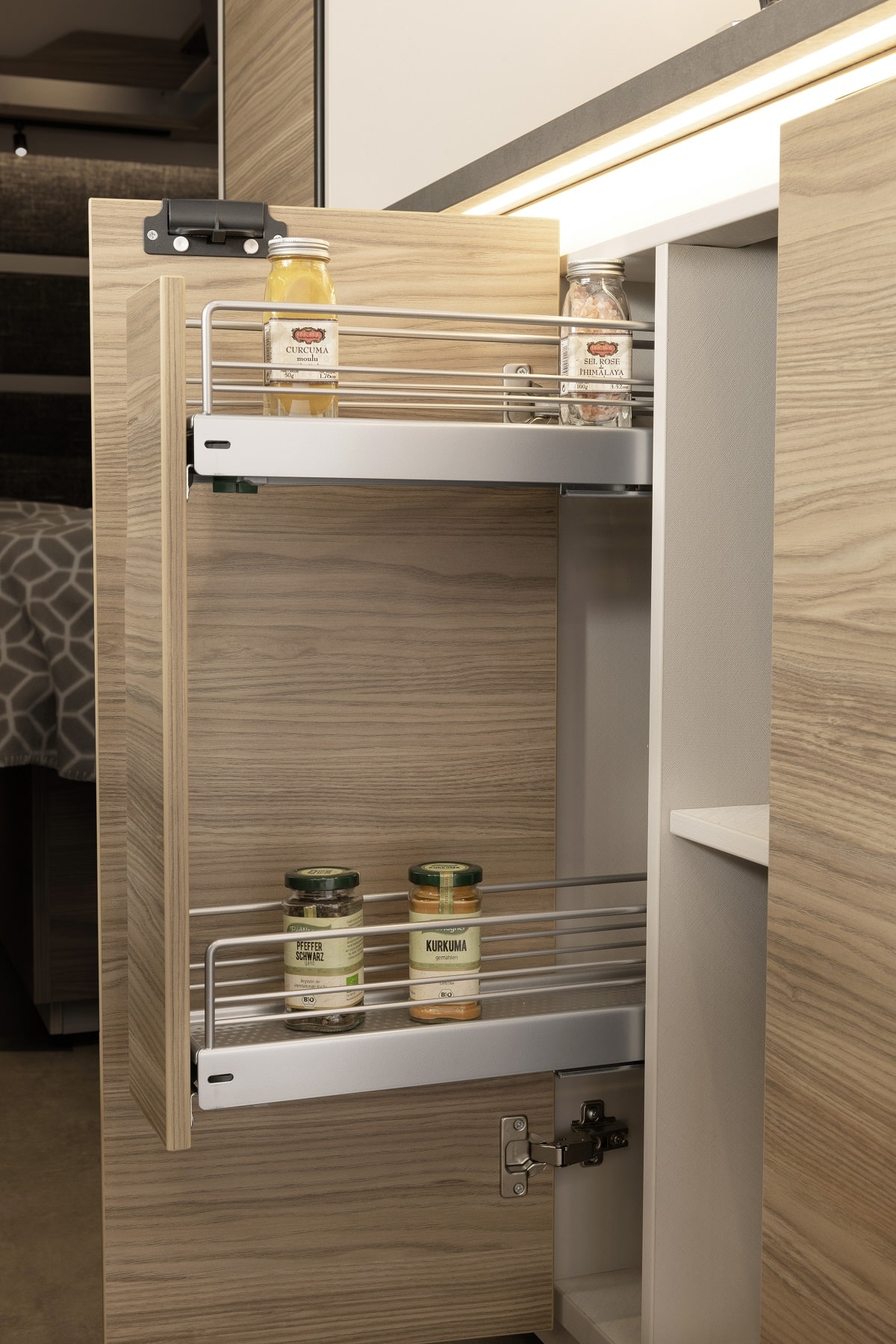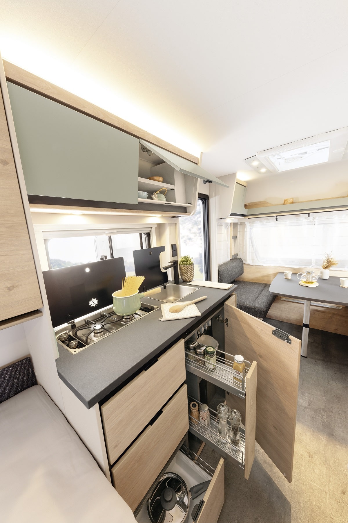 Dethleffs har förnyat interiörerna i Camper och Nomad med en fräsch och elegant stil. Överskåpen har handtagslösa luckor med soft-close. Längst fram och längst bak finns öppna hyllplan för praktisk förvaring vilket samtidigt bidrar till en luftig atmosfär. Sofforna har uppdaterats med nya ryggkuddar med en design som gör att de ser ut att ”sväva” ovanför sittdynorna. Det gör det lättare att komma åt förvaringsfacken under sätena.