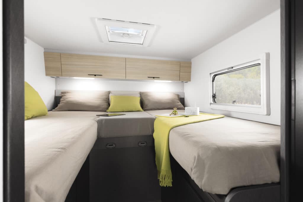 Etruscos serie med plåtisar innehåller redan sju modeller baserade på Fiat. Med CV 600 SB utökas sortimentet med en sex meter lång modell med två rymliga enkelsängar som är upp till 191 cm långa. Tack vare en smart fällmekanism kan ena sängen lyftas upp och skapa upp till 180 centimeter stort förvaringsutrymme baktill, lämpligt för cyklar eller skrymmande packning.