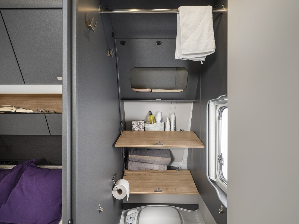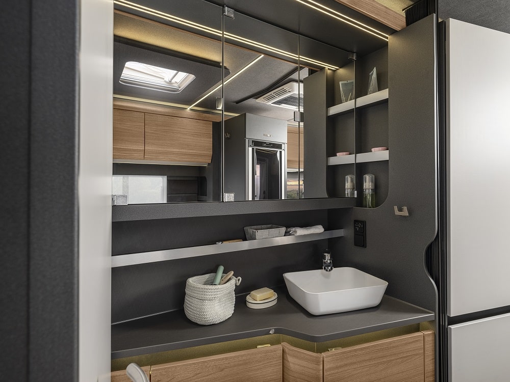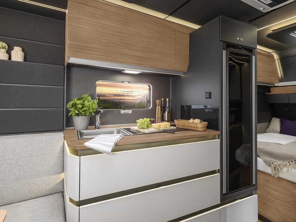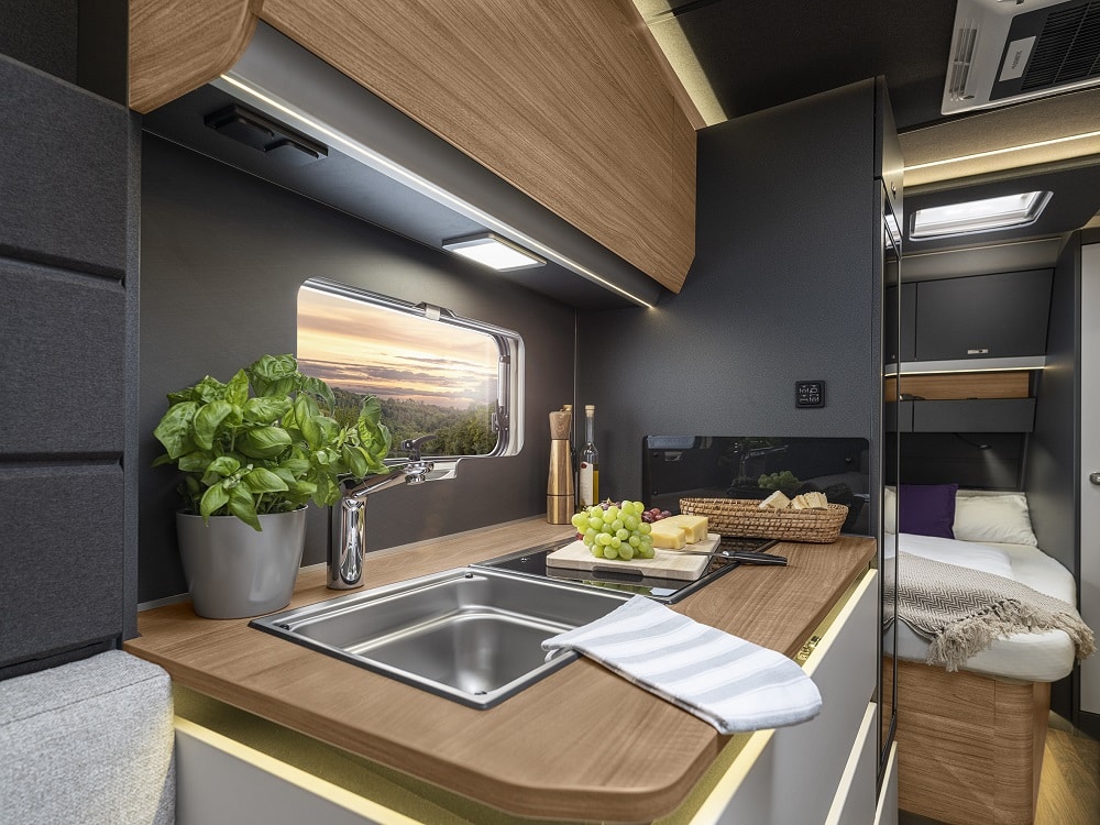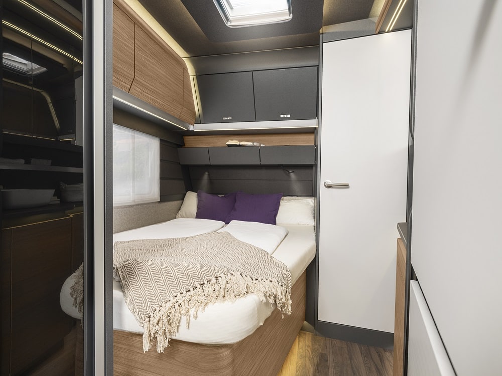 Tonade ramfönster, 17-tums lättmetallfälgar och stilren grafik på ljusgrå sidoväggar ger modellen ett modernt uttryck. En effektfull detalj är ljuslisten som löper längs sidoväggarna och lyser upp vagnens konturer under kvällstid. Nya Azur är försedd med Knaus egen FoldXpand-teknik ger mer utrymme inuti fordonet, utan att yttermåtten påverkas. En lösning som vi såg senast på Knaus Sport.