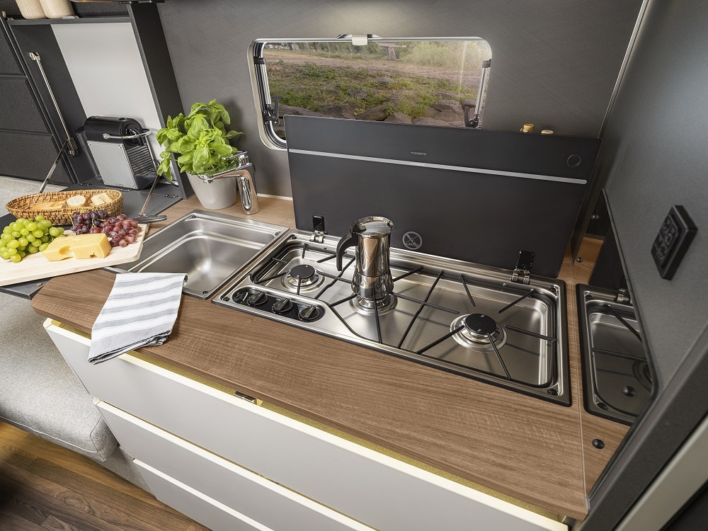 Invändigt hittar vi en modern inredningsdesign med många finurliga lösningar. Till exempel Smart Wall, tygklädda skåpsluckor som kan fällas ner och användas som avställningsyta eller ge plats åt kaffekokaren. Även kuddarna i sittgruppen ”döljer” en funktion; där bak finns förvaringshyllor för småprylar. Fiffigt värre. Knaus Azur presenteras med fyra planlösningar, alla med U-sitttgrupp. 500 FU har en fransk bädd medan 460 EU, 500 EU och 540 UE har enkelsängar. Köket har 3-lågig spis och ett 133-liters kylskåp.