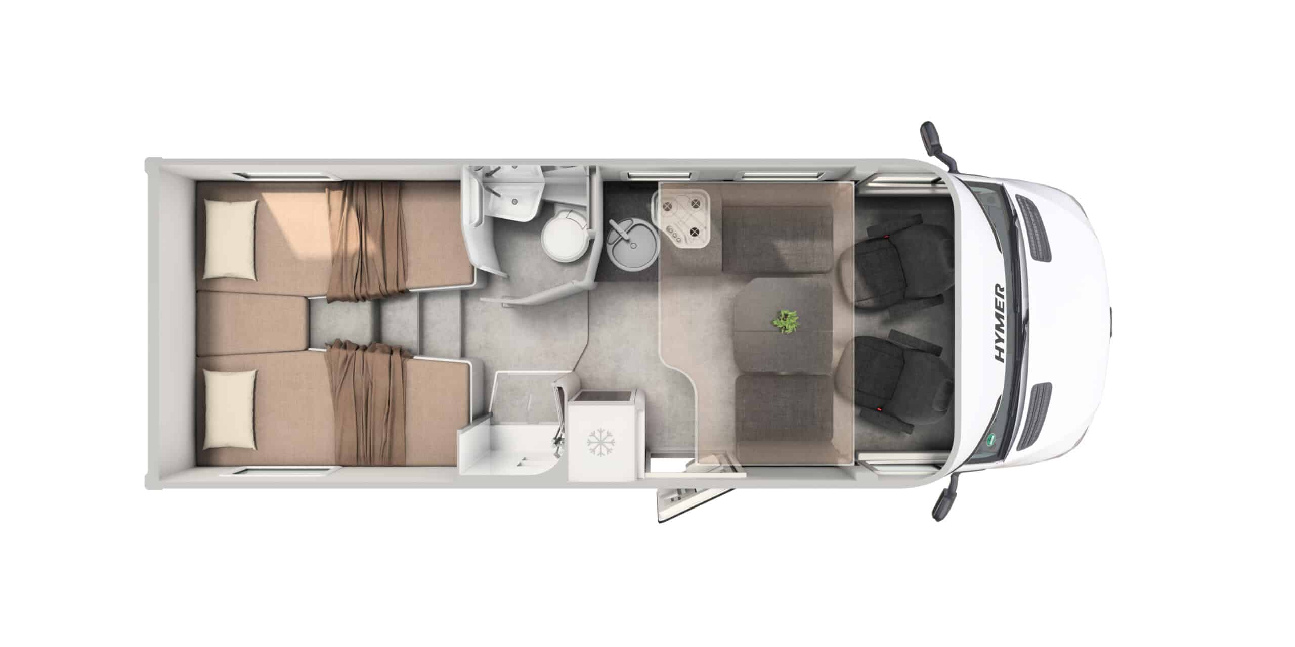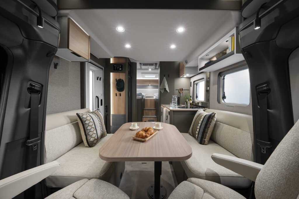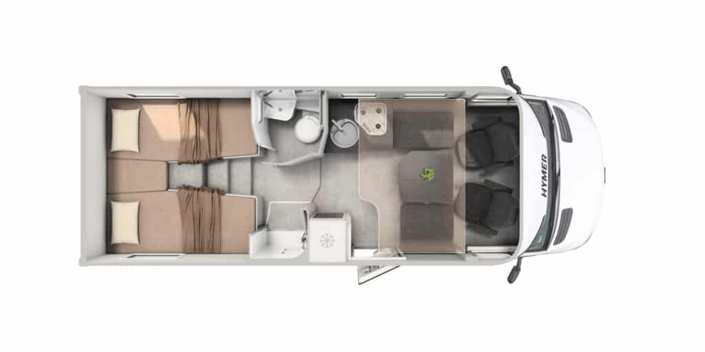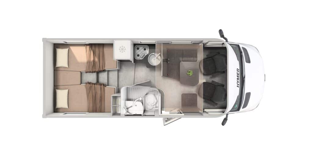 Hymer GT-S är framtagen för att kombinera modern design med beprövade tekniska lösningar. Interiören bygger på ett plant golv och en invändig ståhöjd på över två meter, vilket ger en öppen och luftig känsla. Sittgruppen finns i face-to-face-utförande, ett allt populärare alternativ som skapar en rymlig sällskapsyta i bodelen. Längst bak finns enkelsängar med kallskumsmadrasser. Materialvalen invändigt är moderna och sobert dämpade. I designlinjen “Matara Olive” möts varma träinslag av matta olivtoner och ett golv i betonglook. Exteriört är modellen lackerad i nyansen Stone Grey, vilket tillsammans med diskreta designelement förstärker modellens identitet. GT-S finns i två planlösningar, 600 och 685, med sängplatser för två till fem personer.