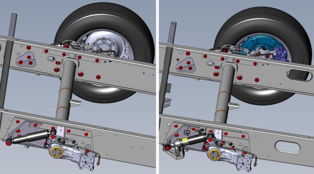 – De aktiva dämparna är försedda med ventiler för tryckreglering. Dessa styrs från en elektronisk enhet monterad i förarens stolskonsol. Lämplig dämpningshårdhet ställs blixtsnabbt in utifrån bearbetad information från sju sensorer som sitter både på de rörliga axlarna och på karossen, förklarar Per Åkerblom.
