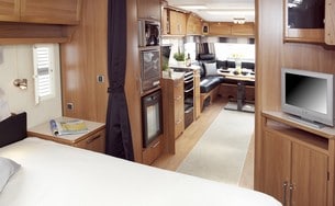 Kabe Royal Hacienda 880 DTDL från svenskproducerade Kabe har fått helt ny planlösning. Det nya är den stora dubbelsängen i sovrummet som står så att man kan gå i sängen från båda sidor och fortfarande med gott om utrymme.