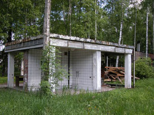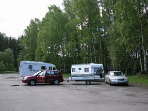 Klicka för större bild Det ryssarna kallar campingplatsNågot av det första man ser, när man kör in i Ryssland, är att skyltarna är nästintill omöjliga att läsa och det är dessutom väldigt lätt att läsa fel. Efter en lång stund hittar vi den enda campingplatsen som finns i St. Petersburg. Den ligger 1,5 mil före centrum i förstaden Olgino. Campingplats är för mycket sagt för det är endast tal om en asfalterad parkeringsplats framför ett hotell.