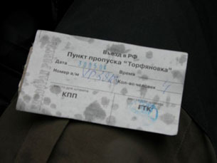 Klicka för större bild Den första gränspassagenDen första gränsövergången är finsk. De kontrollerar våra pass och släpper igenom oss. Nästa post består endast av en bom, där vi får utlevererat en liten papperslapp vilken det står en siffra på. Siffran avslöjar hur många personer vi är i bilen. Vi kör sedan några km i ingenmansland och kommer fram till den ryska gränsstationen.