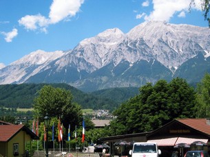 Klicka för större bild Schloss Camping AschachSchloss Camping Aschach ligger i staden Volders, 25 km norr om Innsbruck – avfart mot Vatten. Det är många som använder platsen som transit, så de kommer på kvällen och lättar igen nästa morgon, vilket ger en del oro, men det är faktiskt en god plats där man gott kan tillbringa lite tid. Campingchefen talar och förstår en del danska och platsen har en storslagen utsikt över bergen. Det finns swimmingpool, en liten kiosk och bra sanitära faciliteter, bland anat tvättmaskin och tumlare till fri användning. Det finns också en utmärkt restaurang, där vi äter en stor måltid mat inklusive dessert för endast 10 euro per person. Platsens stora dragplåster är dock, som sagt, den fantastiska utsikten.Vi kommer fram mitt på eftermiddagen i 30 graders värme, så våra tonårsdöttrar, som är med på resan är snabba att äntra den inbjudande swimmingpoolen. Det är gratis för campingplatsens gäster att bada och det finns solstolar vid poolen. Vår nyinköpta pop-up tält är i övrigt en succé – vilket betyder att tjejerna själva kan slå upp det och lägga in madrasser och bädda på under 7 min.