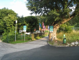 Klicka för större bild VoldersPlatsen ligger mitt i staden, med Schloss Aschack som ligger fallfärdigt, men dock ganska majestätiskt bakom campingplatsen. Man kan ta sig upp till slottet via en stig till höger om campingplatsen, men det kan dessvärre bara beskådas utifrån. I utkanten av byn finns en kristallverkstad Swarovski Kristalwelten som har öppet dagligen mellan 9 och 18.30 (entré 8 euro) och några tycker att ett besök absolut är värt pengarna. Andra säger att det på ett annat ställe mitt inne i staden finns en turistattraktion i form av en bondgård, där djuren bor i källaren och bondfamiljen på första våningen, och det skall vara öppet mellan djur och människor!? Denna gång har vi inte tid att se det då vi skall hinna med en färga i Ancona.Jag går en tur i staden och en söndag eftermiddag i juli är det endast lite liv vid den lokala grill- och glassbaren som ligger ett par gator ifrån campingplatsen. Jag njuter av alla de vackra trädgårdarna där det arbetas mycket med plantering, stensättningar och allvärldens trädgårdstomtar, skulpturer och andra roliga saker. FaktaPlatsens hemsida är lite tråkig, men klicka på ”Bilder”, för det har de några riktigt bra. Vi betalade 41,70 euro för en övernattning för 4 vuxna, en hund, en camper och ström.Schloss Camping Aschack ligger som redan nämnts på kort avstånd från motorvägen och det är bra skyltat  fram till platsen.