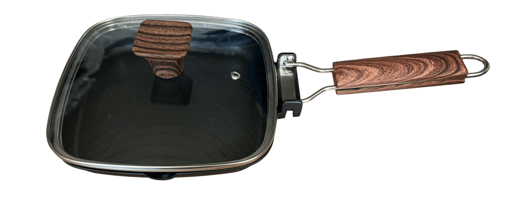 Fyrkantigt stekjärn med maximal stekyta och non-stick-beläggning. Handtaget kan fällas in för att ta minimalt med plats i köksskåpet. Pris 299 kronor hos LTC. Ett tillhörande lock kan köpas till för 99 kronor.
