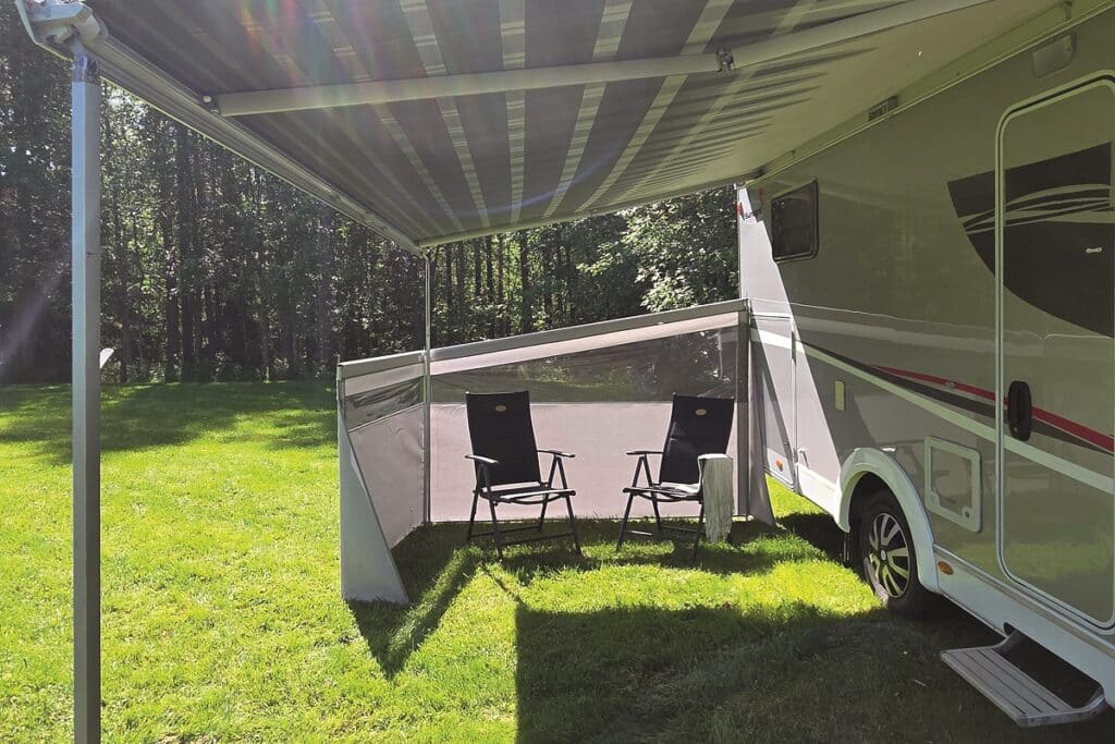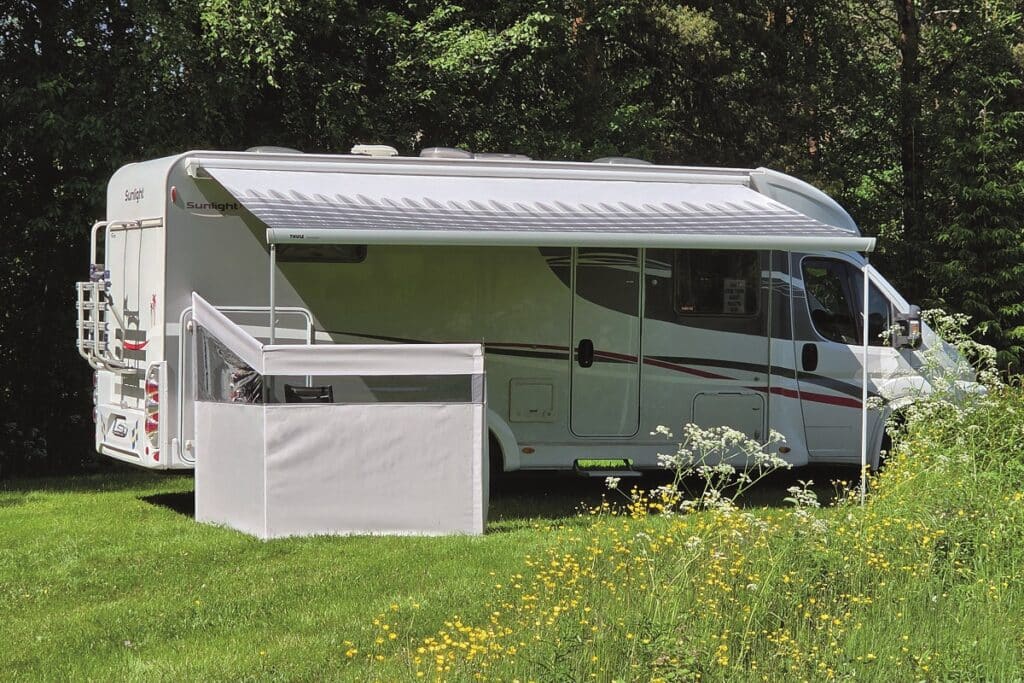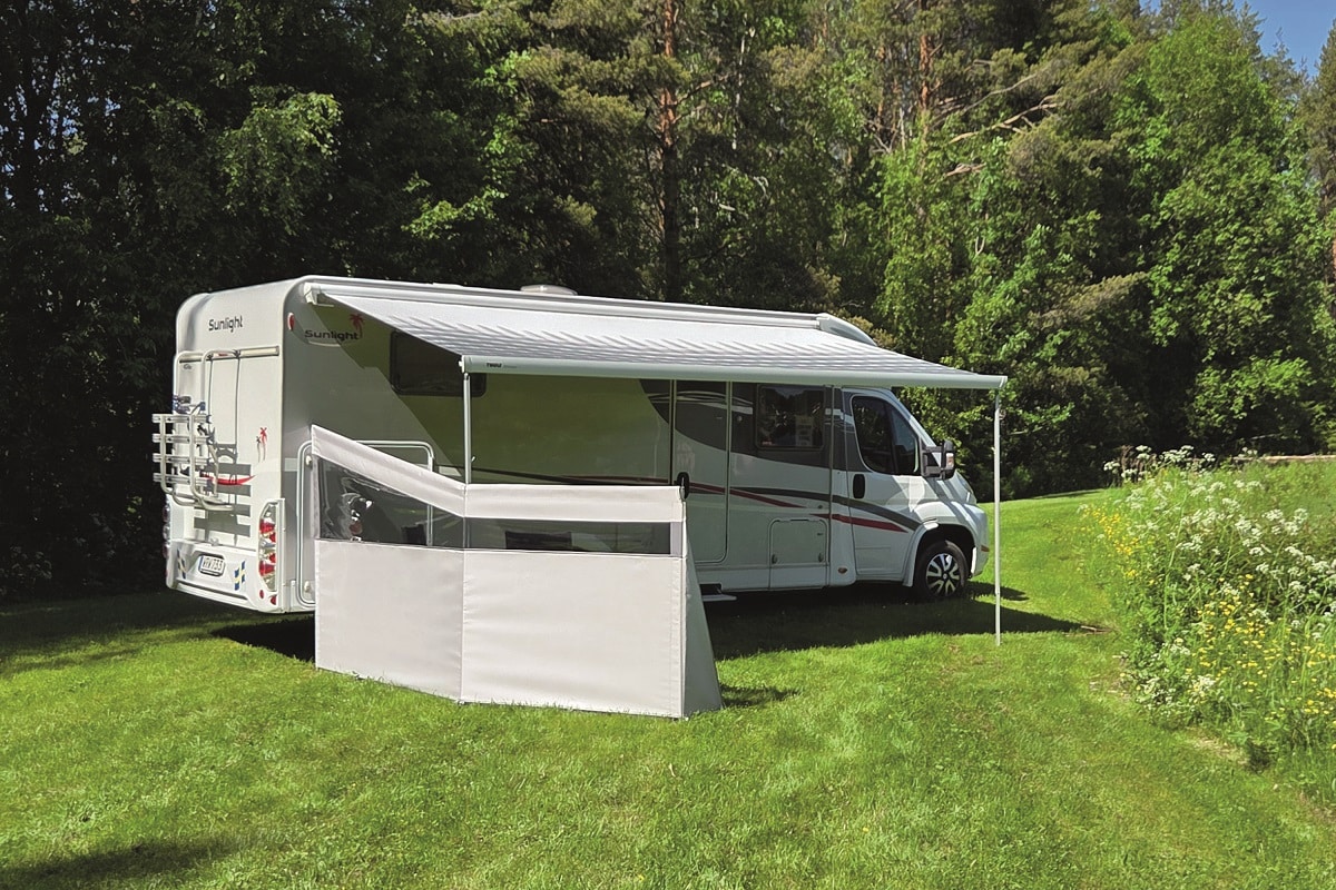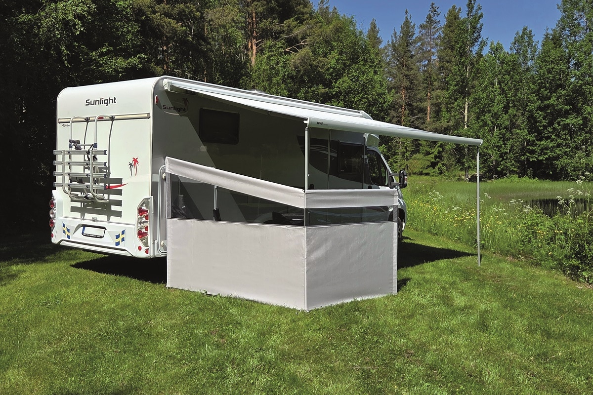 På Elmia visade Svenska Tält upp sitt nya vindskydd Comfort. Det är utvecklat för husbil och markis, men fungerar lika bra för husvagn med påsmarkis.
