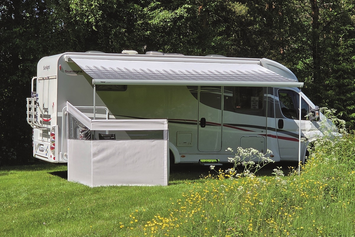En annan nyhet som fått stort genomslag är ett vindskydd till husbilsmarkiser. Det heter Comfort och är utvecklat för husbil och markis, men fungerar lika bra för husvagn med påsmarkis. Comfort är fristående och passar till alla husbilar, husvagnar och campers med eller utan markis. Vindskyddet har en totallängd på 385 centimeter och består av två sektioner som kan vinklas efter önskemål. Den högre sektionen är 235 centimeter lång vilket passar majoriteten av alla markisers djup. Monteras med markisens markben på insidan eller utsidan av vindskyddet beroende på markisens utfall. Comfort är enfärgad i ljusgrå nyans.