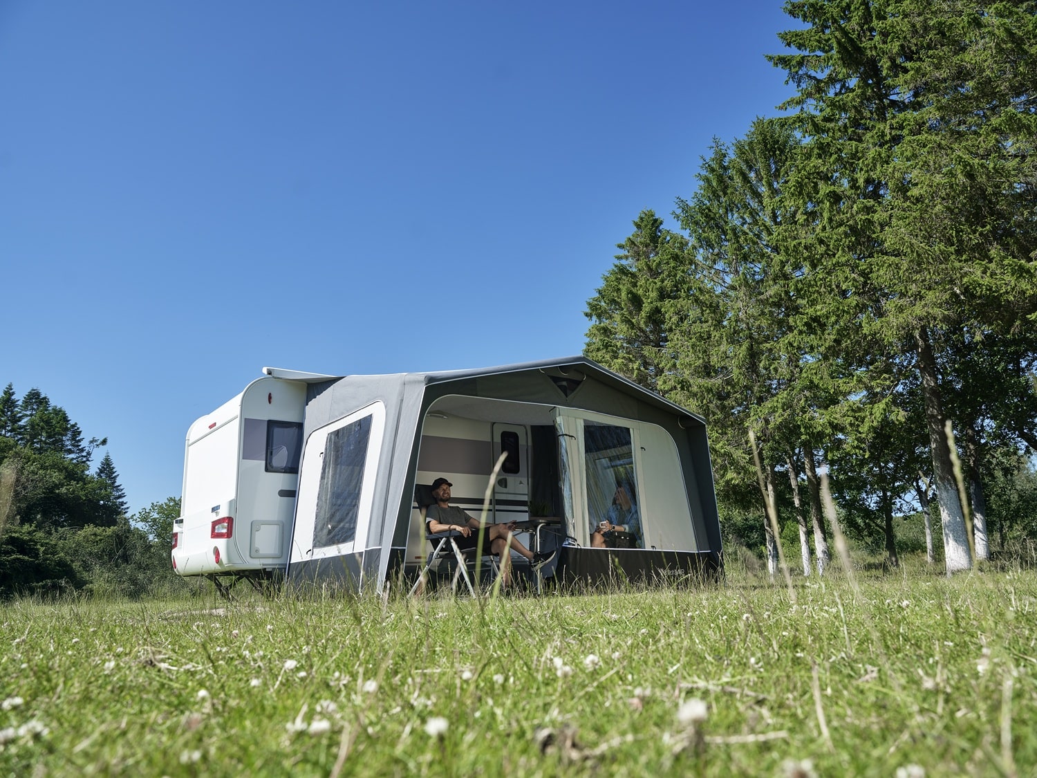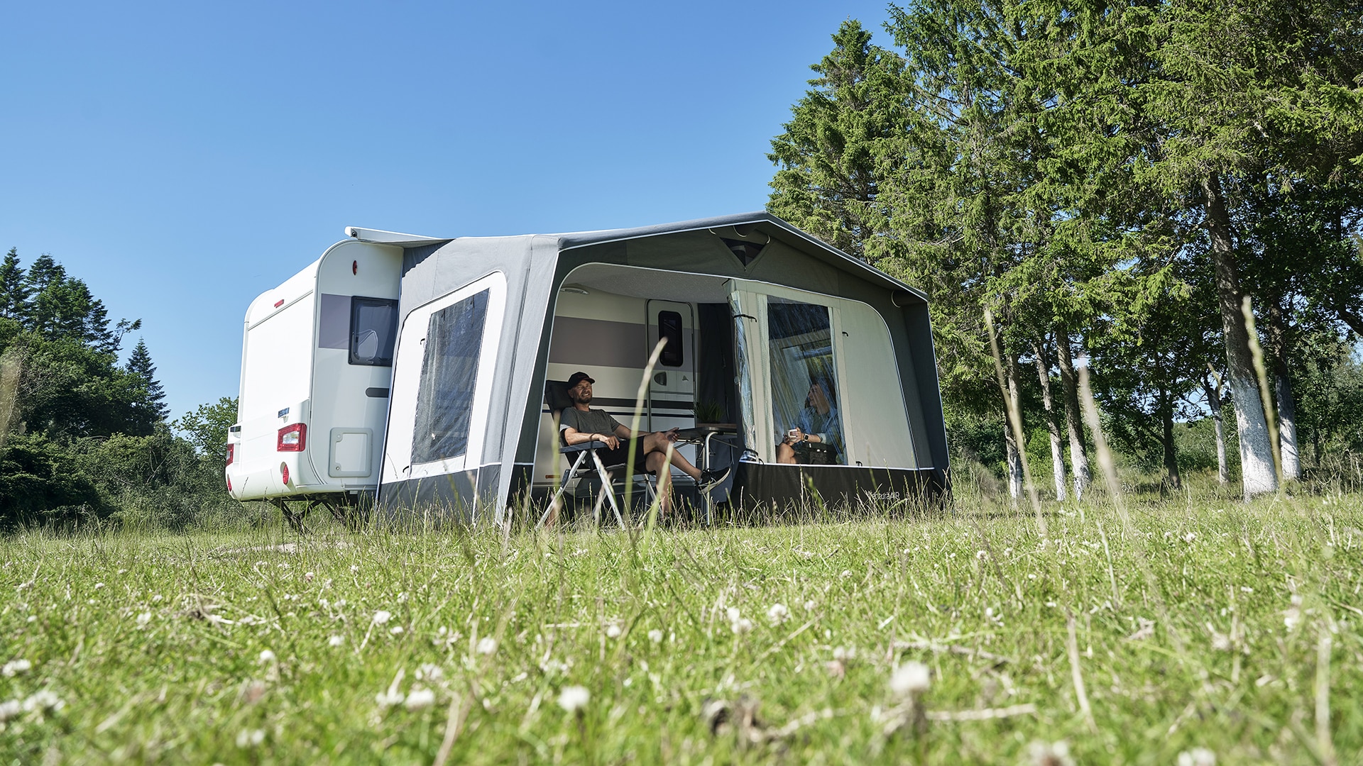 Taken är tillverkade i tryckt polyester med textillook som döljer smuts och är lätt att underhålla. Tältsidorna är i färgad polyester och den slitstarka gräskanten i PVC-blandning skyddar mot markfukt. Designen är stilren med svart botten och mörkgrå luftkanaler. Det tryckta innertaket ger en varm och ombonad känsla. Annex kan monteras på höger eller vänster sida för extra sov- eller sällskapsyta. Vissa modeller kan kompletteras med sidopaneler, tunnel (till fristående modeller) eller verandaalternativ.