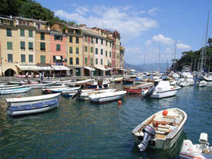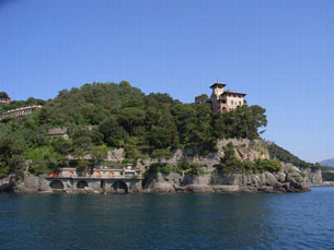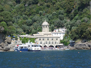 Klicka för större bild En tur på vattnetEn dag räcker inte i detta område. En tur till Genua är en möjlighet – en annan är att se närmare på kuststräckan och halvön Portofino. Det är en fantastisk dag, då vädret visar sig från sin finaste sida. Kusten är imponerande vacker. På en gång både dramatisk och inbjudande. Färgspelet mellan den blå himmeln, de färgglada husen i röd-bruna och gula nyanser står vackert mot det de gröna träden och det azurblå havet. Det tager en timme att segla till Portofino. Båten lägger också till i Santa Margherita Ligure, men fortsätter till halvöns mest exklusiva badort. Under en lång dag kan man visst besöka båda städerna.