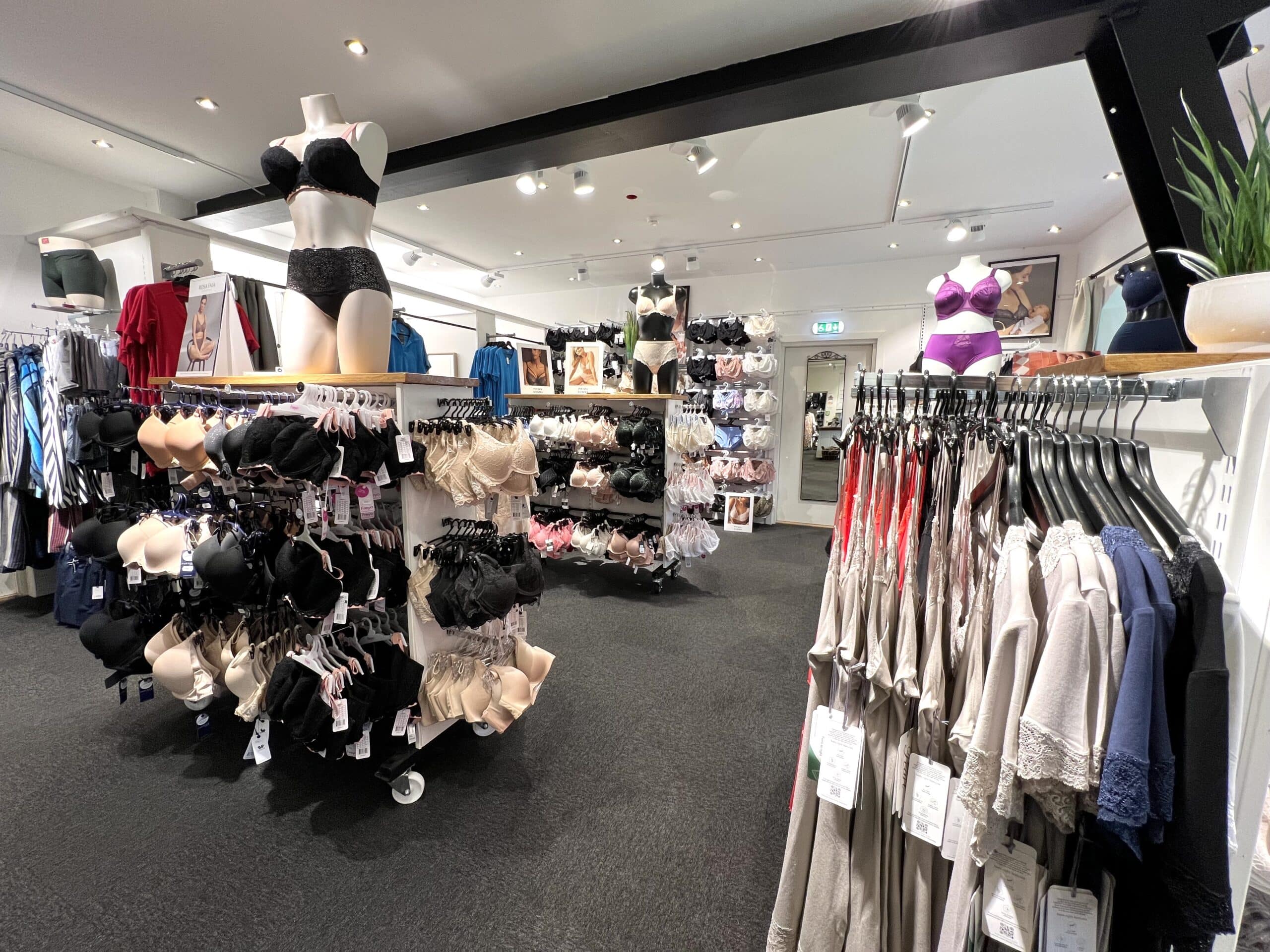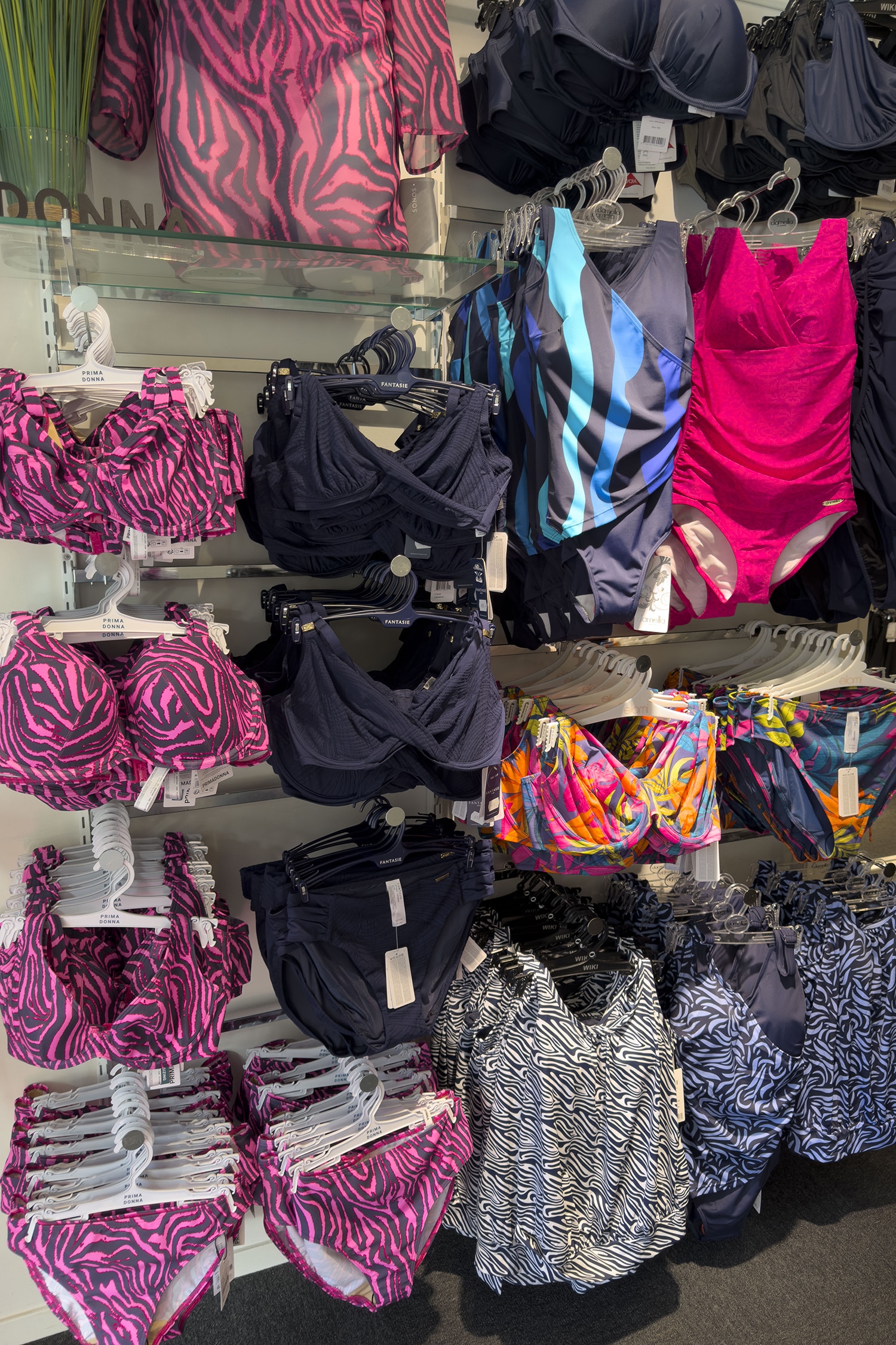 Med mer än 35 varumärken och över 3 300 artiklar i sortimentet är det breda utbudet en av butikens styrkor. Här finns badmode i storlekar 36–56 och bh:ar i kupa AA-R och omkrets 60–120, ett storleksspann som få butiker i landet kan matcha. Sortimentet är noga utvalt för att passa olika kroppar, behov och livssituationer. Badmode året runt, sportbh:ar för olika aktiviteter, protesbh:ar och badmode med protesfickor, amningsbh:ar i både mindre och större storlekar samt nattkläder, morgonrockar och underställ.