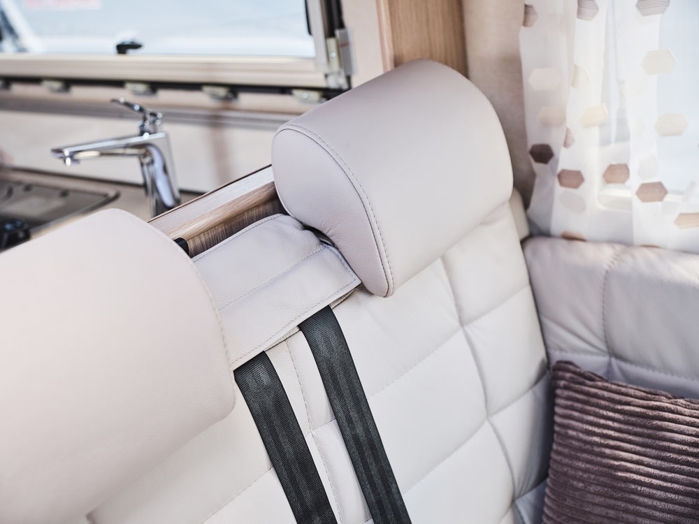 – Dinettsoffan med två bältade platser har en konstruktion som hindrar att dynan glider iväg vid en krock.
